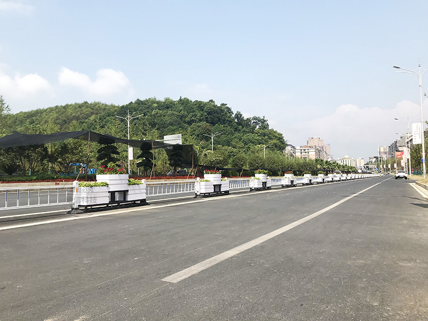 道路上的隔離花箱可選花箱護欄,花箱與護欄結(jié)合,滿足戶外市政使用需求:耐用、免維護、美觀。